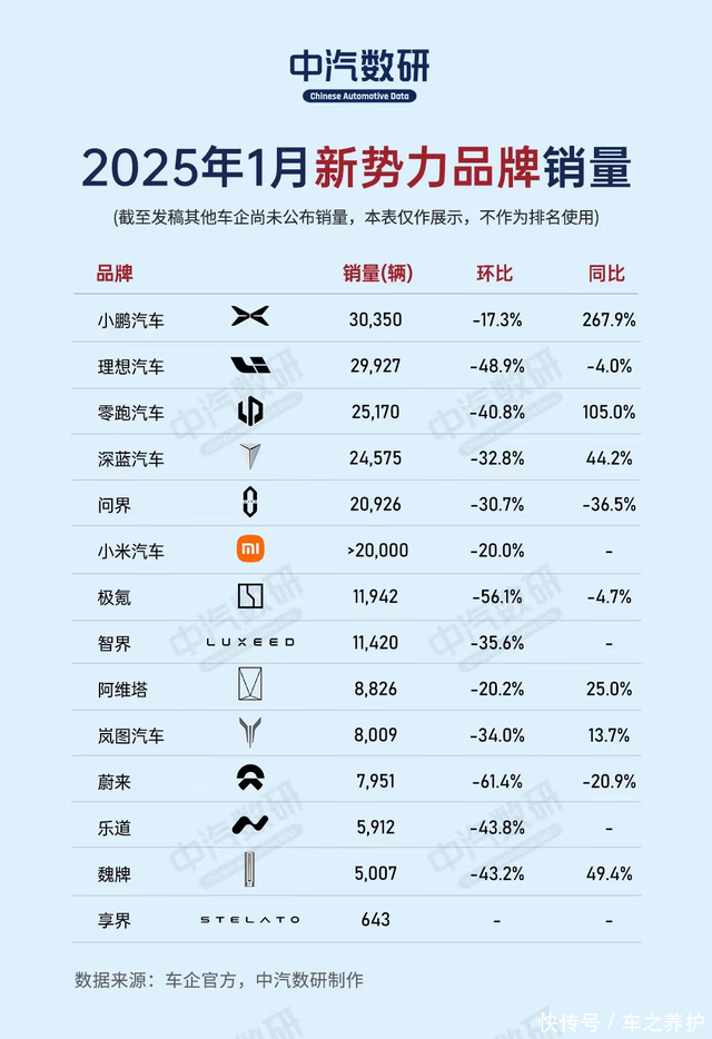 由于春节的原因,每年1月国内汽车阛阓的销量王人会相较旧年年底有小幅度的回落,这亦然平常的季节性礼貌,近期中汽数研发布了2025年1月新势力品牌销量排名榜,从榜单的排名情况来看,新势力阵营中出现了较大的排名变化,接下来咱们就来望望各款品牌的推崇。