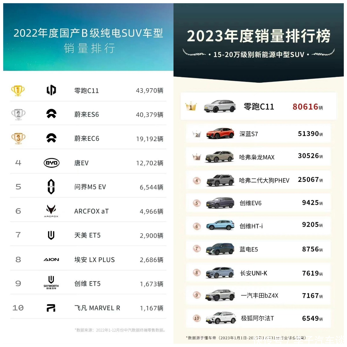 就拿其中的零跑C11来看,在2022年国产中型纯电SUV车型销量排名榜中排在第一位,年度销量为43970辆;2023年度15-20万级别新能源中型SUV销量排名中则以80616辆的收获,排在第一位。而干预2024年度,零跑C11的热度依旧不减,一语气三年的热销也足以诠释用户对于这款车的招供度照旧比较高的。