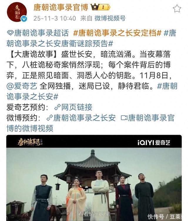 古装悬疑界的“天花板”终于官宣了!备受期待的《唐朝诡事录之长安》(简称《唐诡3》)追究定档11月8日,不仅比原方针提前两天上线,更将完了爱奇艺全网独播与北京卫视黄金档同步播出的“双平台加抓”。 音书一出,爱奇艺预约量短暂约束235万,豆瓣剧粉直呼“年度悬疑DNA绝对醒悟”,这场盛唐诡案盛宴决然未播先火。