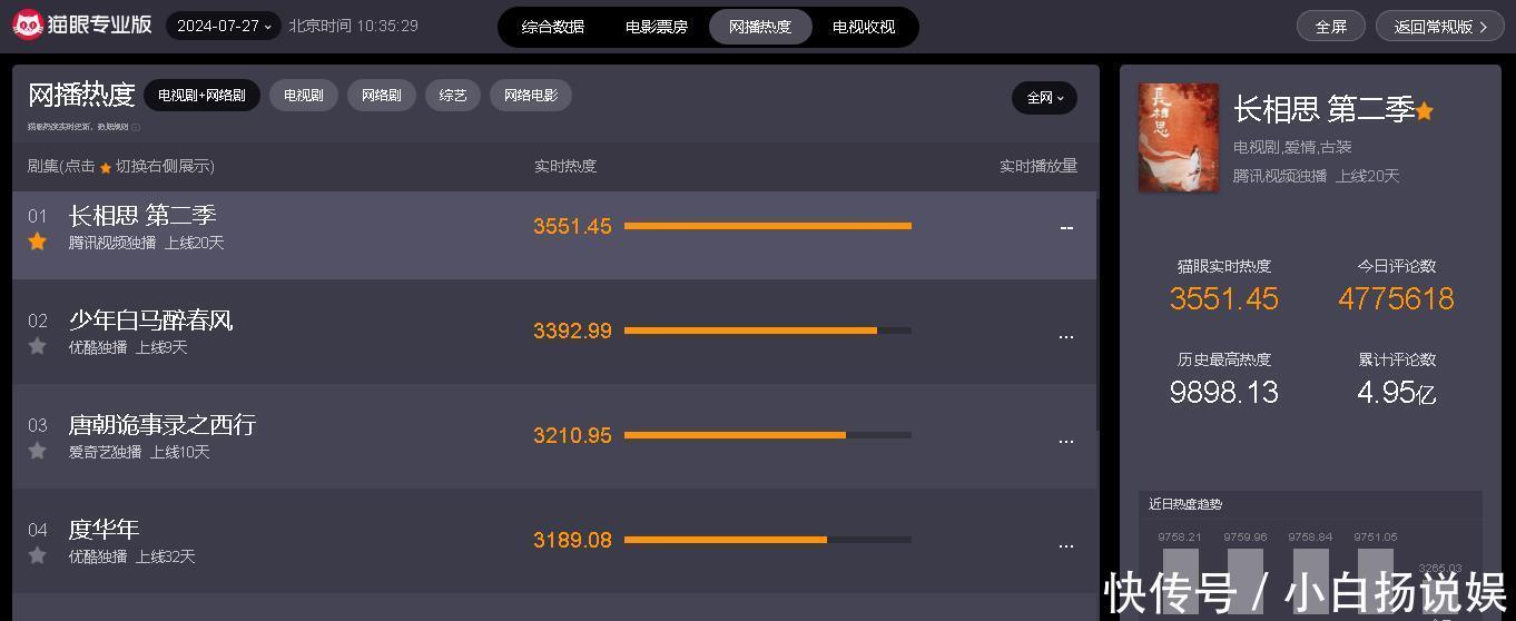 消释7月27日上昼10时35分,从“猫眼专科版”及时数据流露可知,刻下热播电视剧中,网播热度最高的五部剧永别如下: