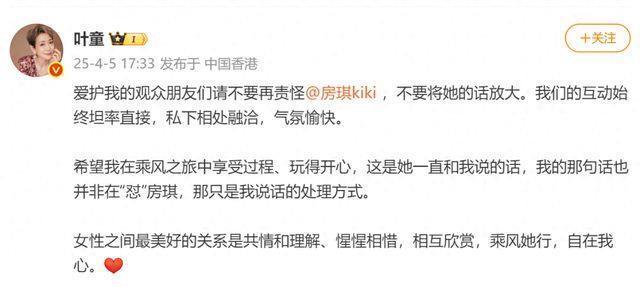 4月5日,叶童在酬酢平台发文复兴“回怼房琪”,其称:“叹息我的不雅众一又友们请不要再箝制房琪,不要将她的话放大。咱们的互动历久坦爽气接,私行相处融洽,敌视喜悦。”