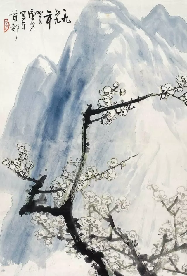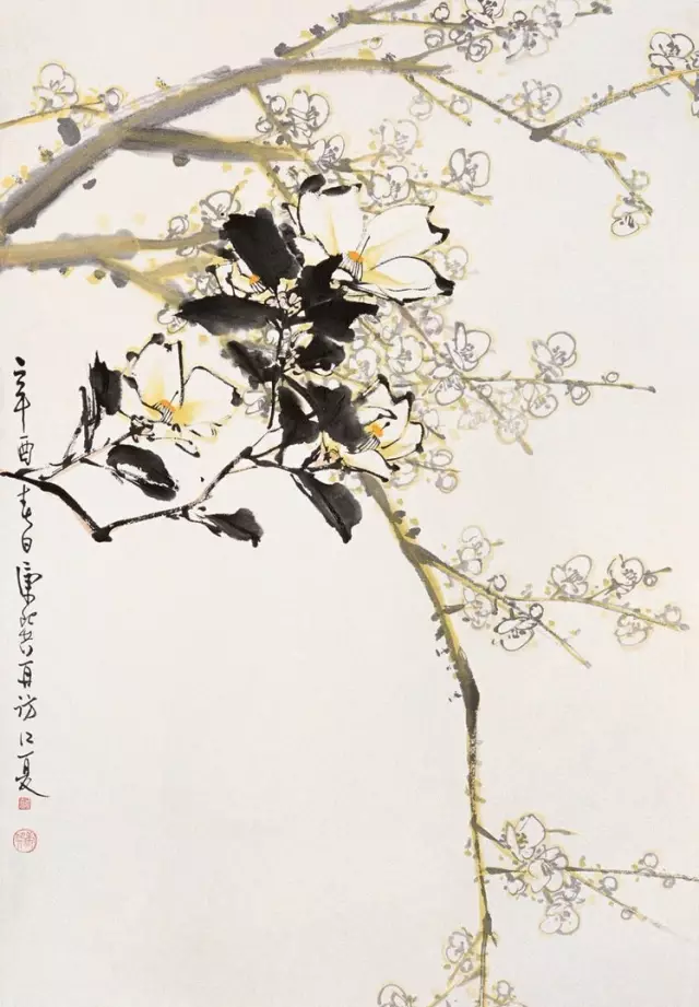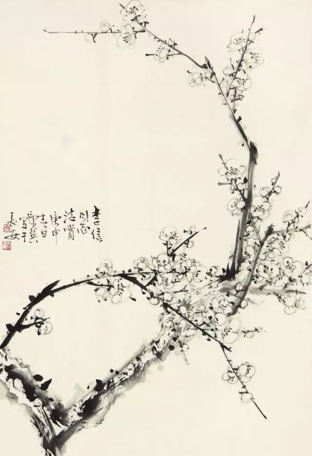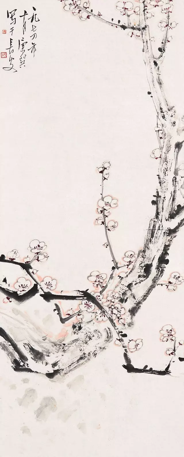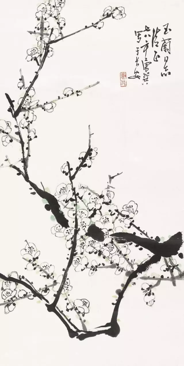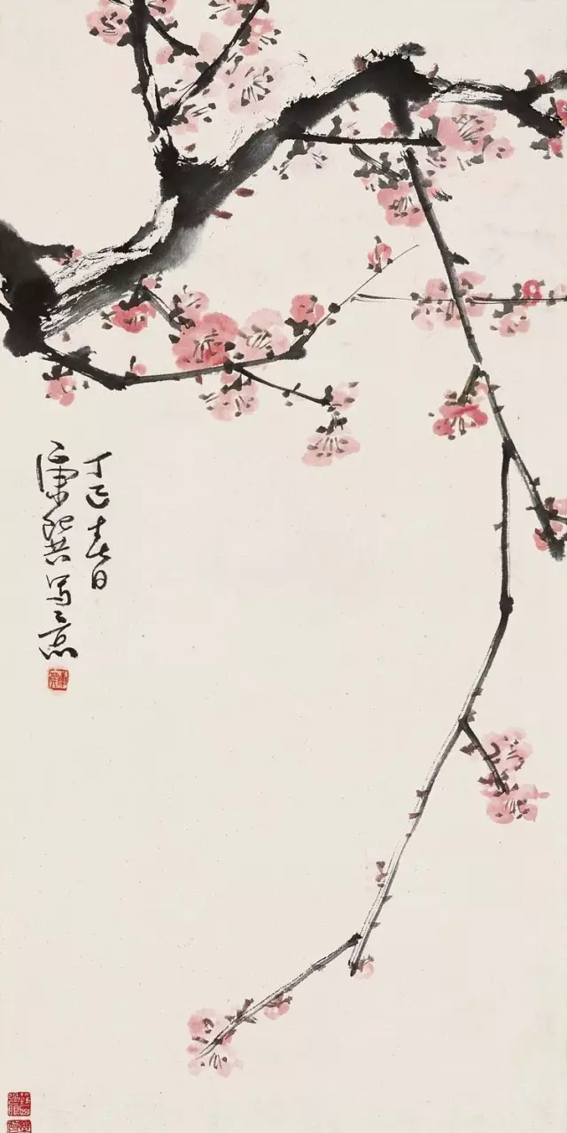 再说梅花,他可不玩“圈花点蕊”的老把戏。白梅用淡墨勾花瓣,浓墨点花蕊,虚实一双比,花瓣的向背全出来了;红梅更绝,胭脂调洋红,浓色点瓣心,浅色铺瓣缘,眉目轻得像飘落的雪。最妙的是,他画红梅的花瓣不是圆的,而是方的——像被西北风削过的棱角,倔得可人。
