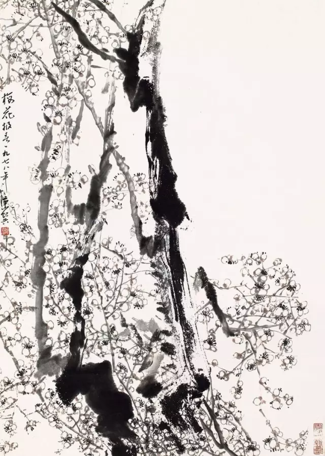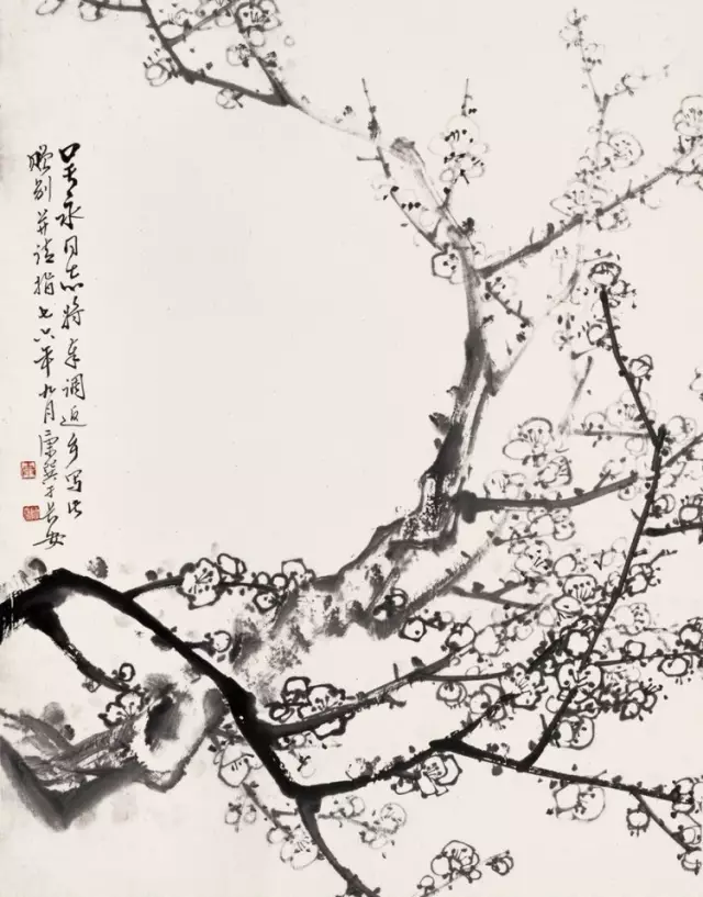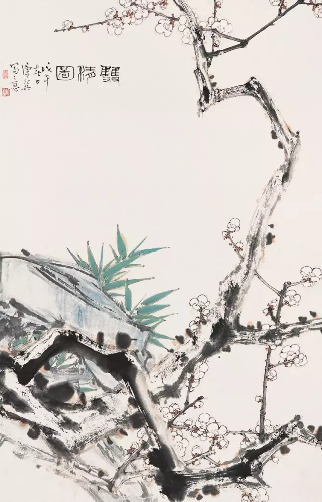 先看枝干,他无须细笔描,偏疼焦墨“泼”出来。老干像被风沙磨过的树皮,干裂中带着劲谈;细枝则像被风吹弯的铁丝,瘦硬中藏着弹性。比如《双清图》里的梅干,枯笔勾皴配湿墨晕染,斑驳得像老农的手,一看即是吃过苦的。